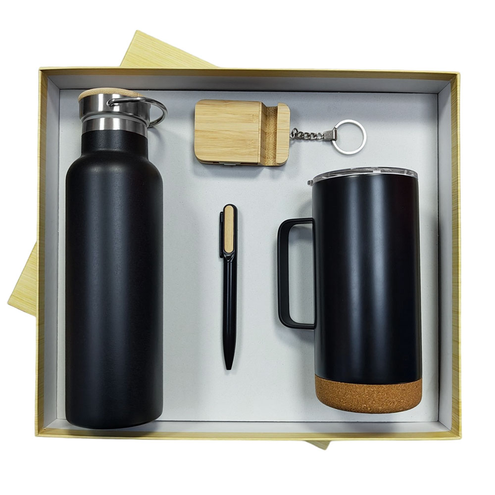 Set Includes: Metal Bottle, Wooden Keyring, Metal Pen & Eco Mug