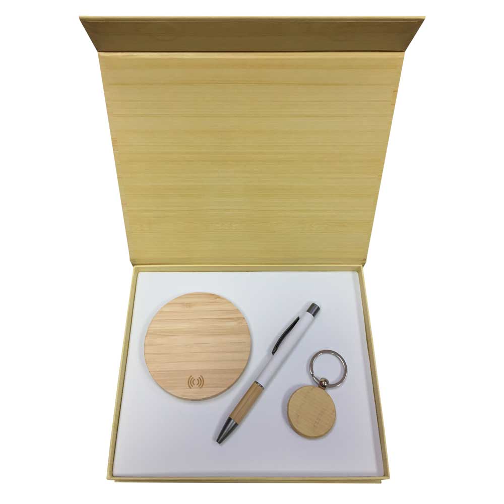 Set Includes: Wooden Wireless Charger, Metal Pen & Wooden Key Chain