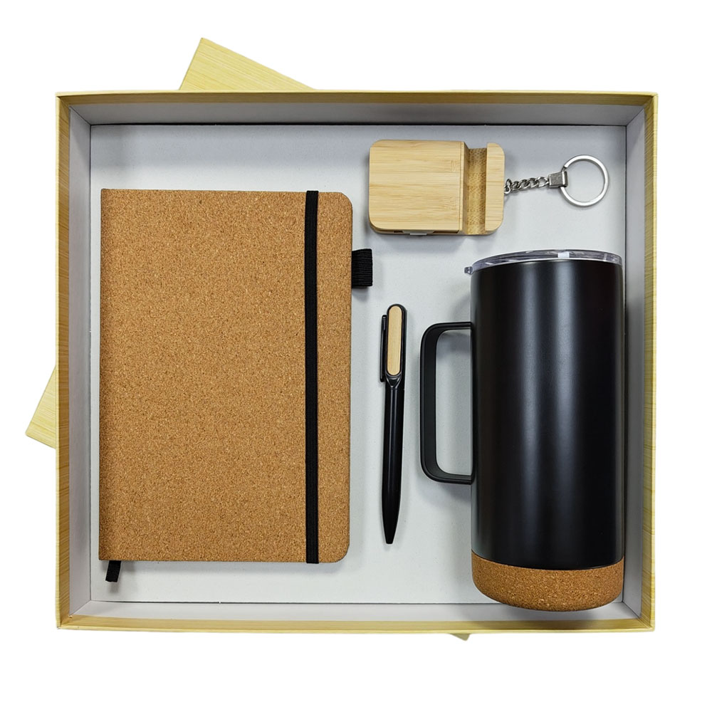 Set Includes: Cork Notebook, Metal Pen, Wooden Keyring, Eco Mug